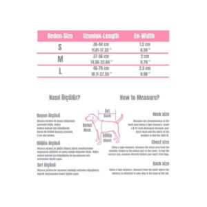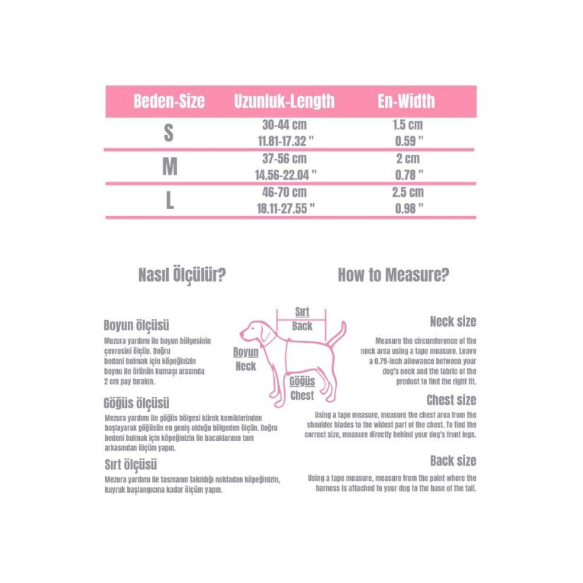 • Ölçüler: Large beden; 46-70 cm arası göğüs genişliği ve 2.5 cm kemer eni ile orta ve büyük ırklar için idealdir.