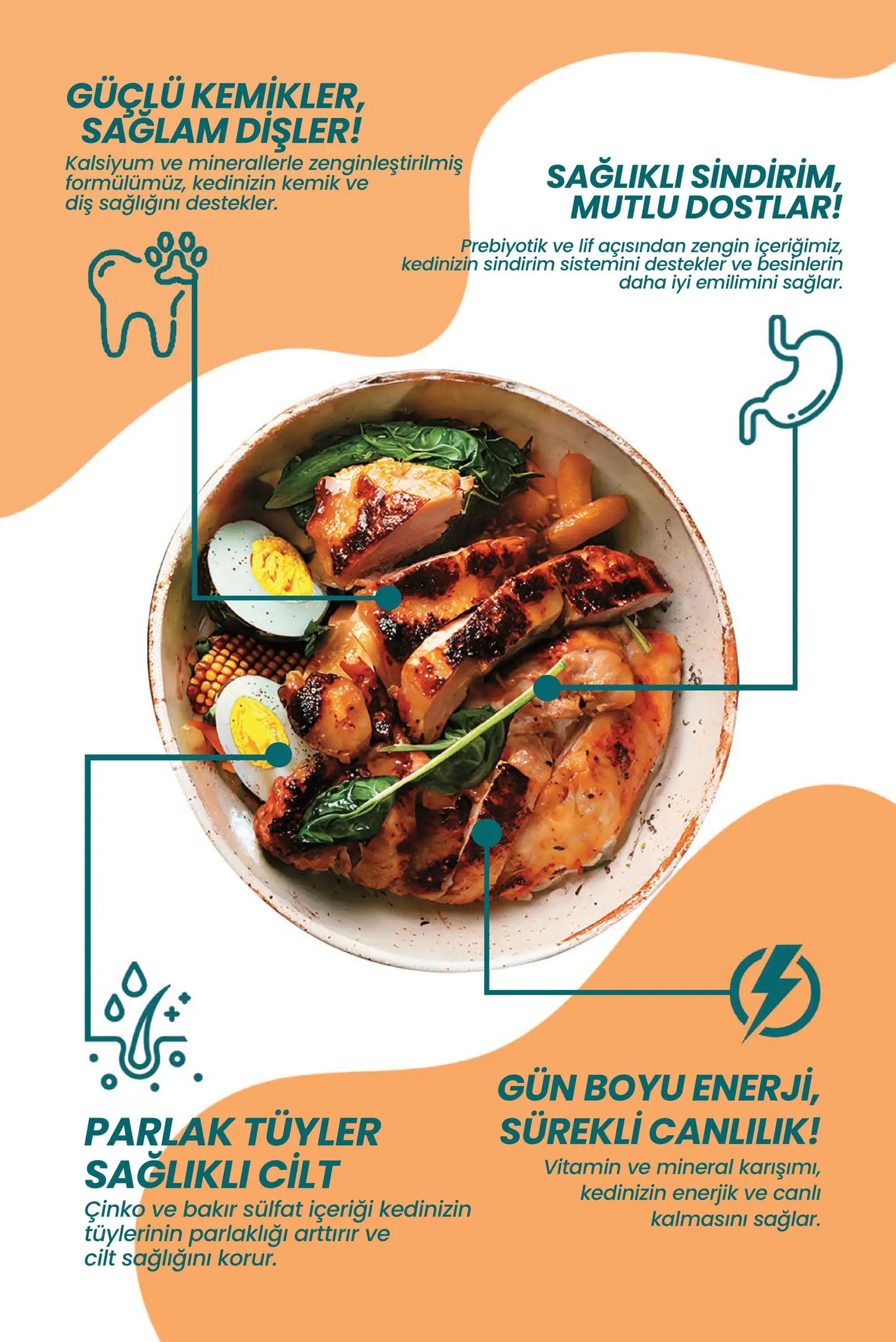 • İçindekiler: İşlenmiş Tavuk Proteini (%25), Pirinç, Mısır Glüteni, Mısır, Tavuk Yağı, Hidrolize Tavuk Ciğeri, İşlenmiş Balık Proteini, Bira Mayası, Hamsi Yağı, Prebiyotik MOS, Bal Kabağı, Havuç, Ispanak.